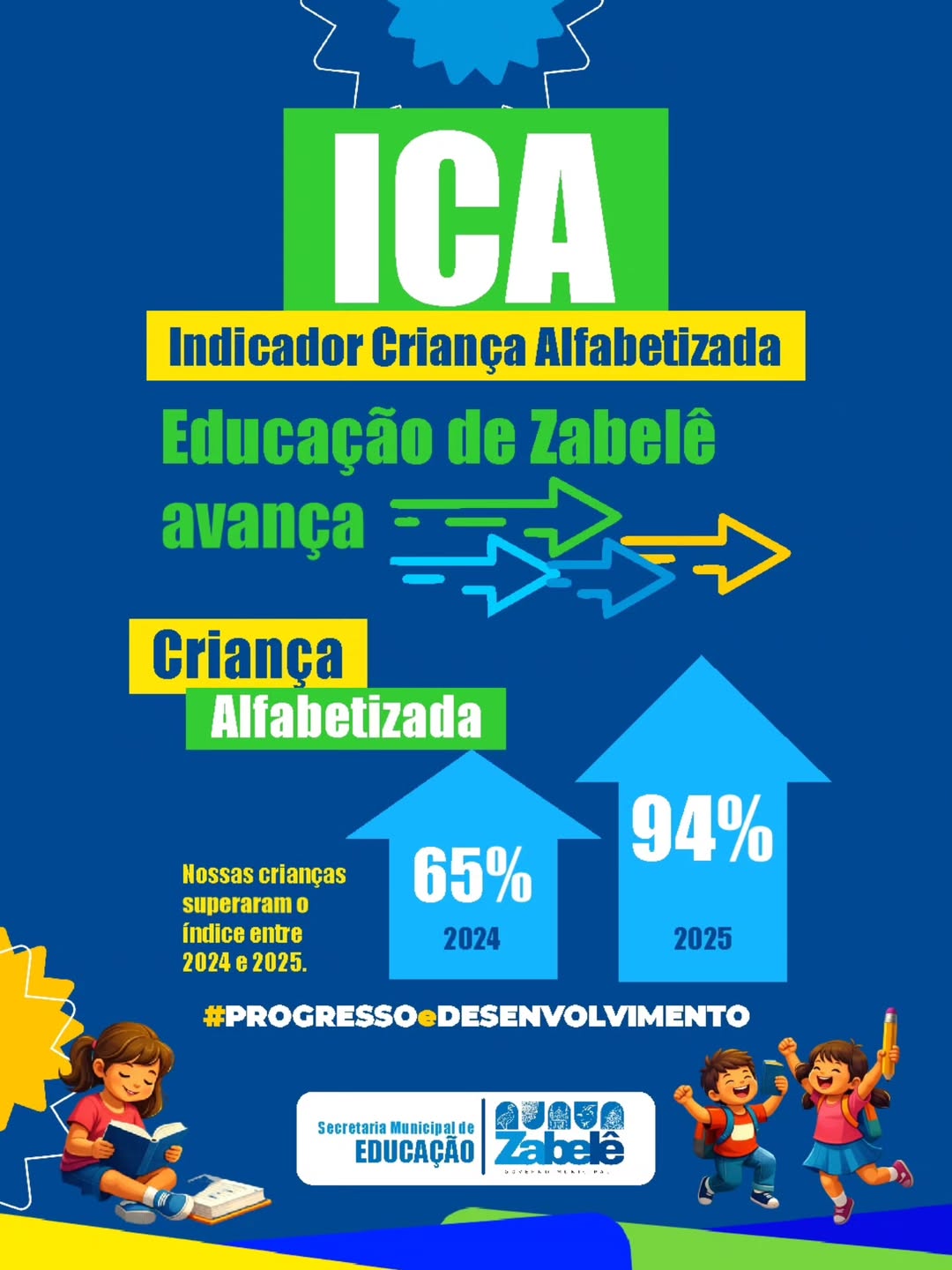 Saímos de 65% em 2024 para 94% em 2025 no Indicador Criança Alfabetizada (ICA), um crescimento significativo que demonstra o compromisso, a dedicação e o trabalho coletivo de toda a equipe educacional.